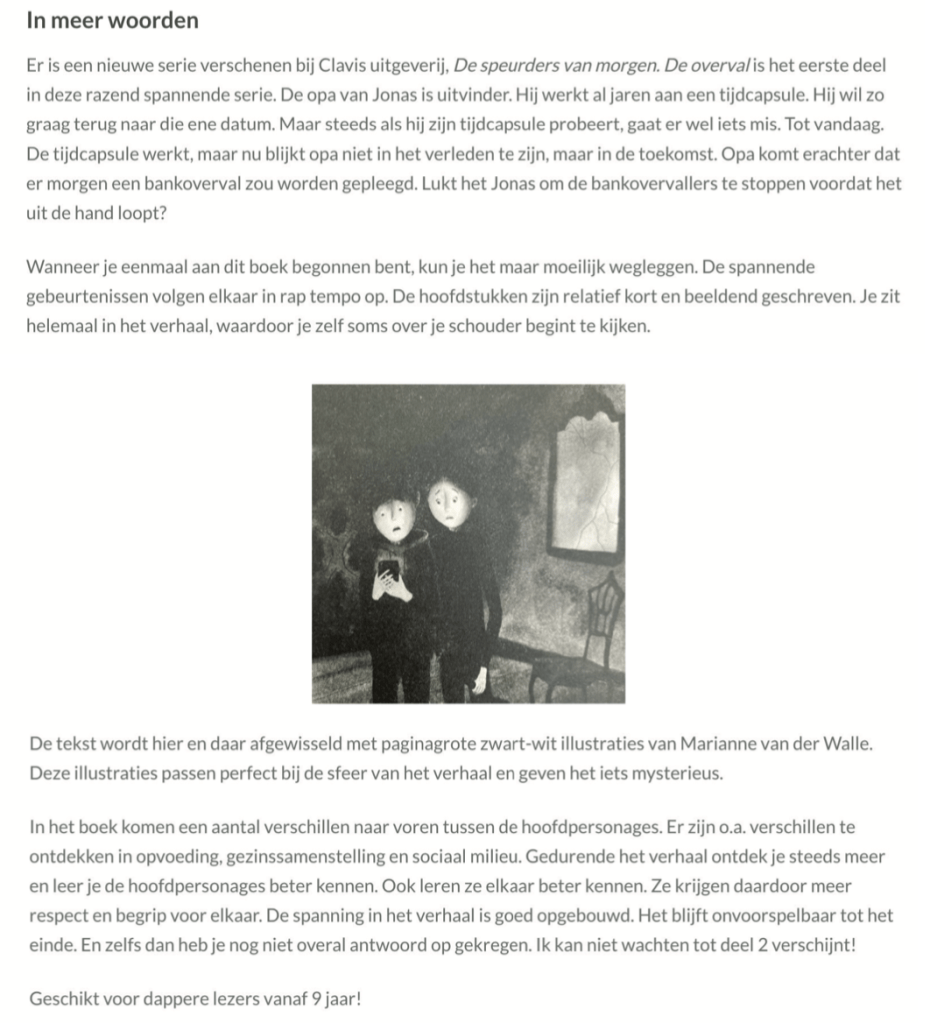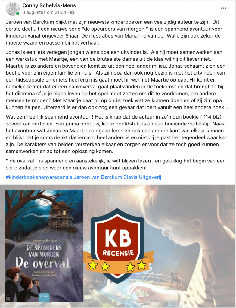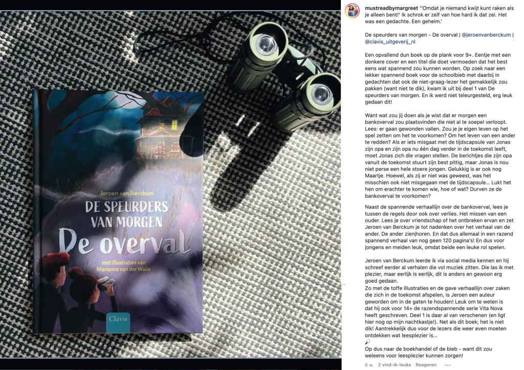 Recensies “De speurders van morgen – De overval” Recensie MustreadbyMargreet op Instagram Recensie Kinderboekenjournaal Recensie kinderboeken en ya Dit delen: Klik om te delen op X (Opent in een nieuw venster) X Klik om te delen op Facebook (Opent in een nieuw venster) Facebook Vind-ik-leuk Aan het laden...