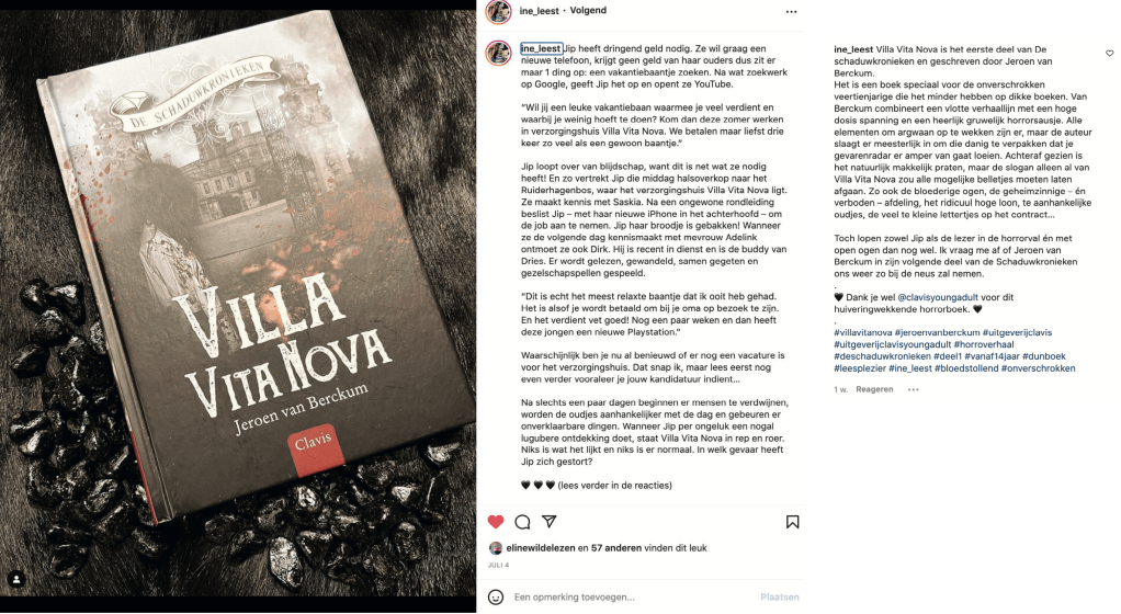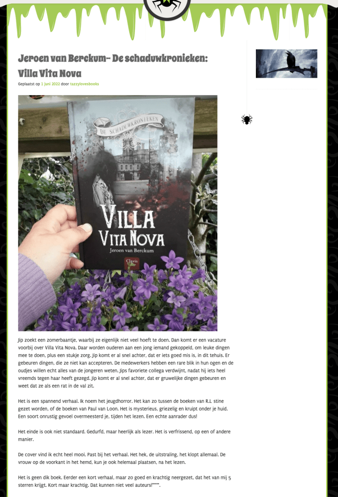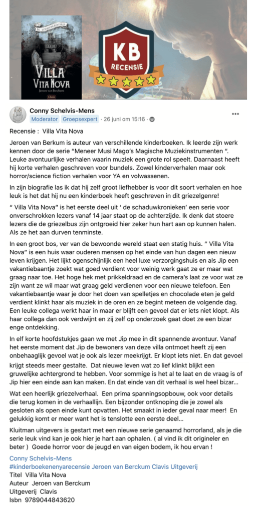 Recensies “Villa Vita Nova” 26-06-22 Recensie van Conny Schelvis-Mens voor de Facebook-groep Kinderboeken en ya 01-06-22 Recensie van Tazzy Jeninga van Ik hou van Horror, Fantasy en spannende boeken 04-07-22 Recensie Ine Leest op Instagram Dit delen: Klik om te delen op X (Opent in een nieuw venster) X Klik om te delen op Facebook (Opent in een nieuw venster) Facebook Vind-ik-leuk Aan het laden...